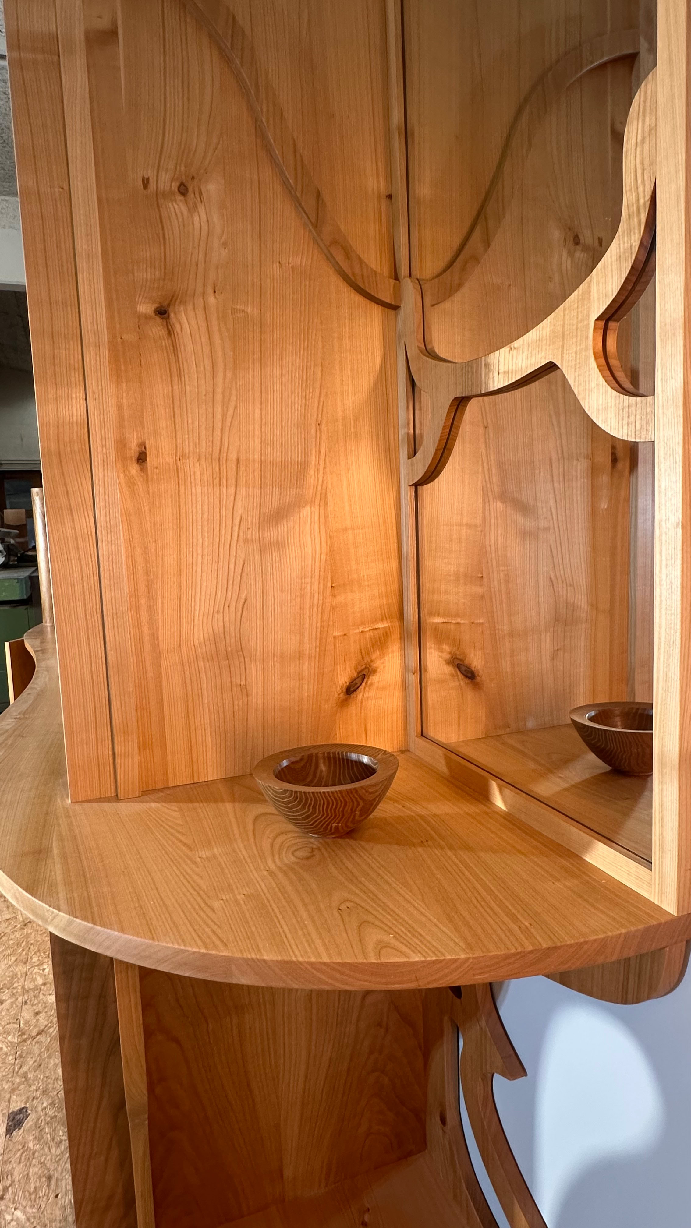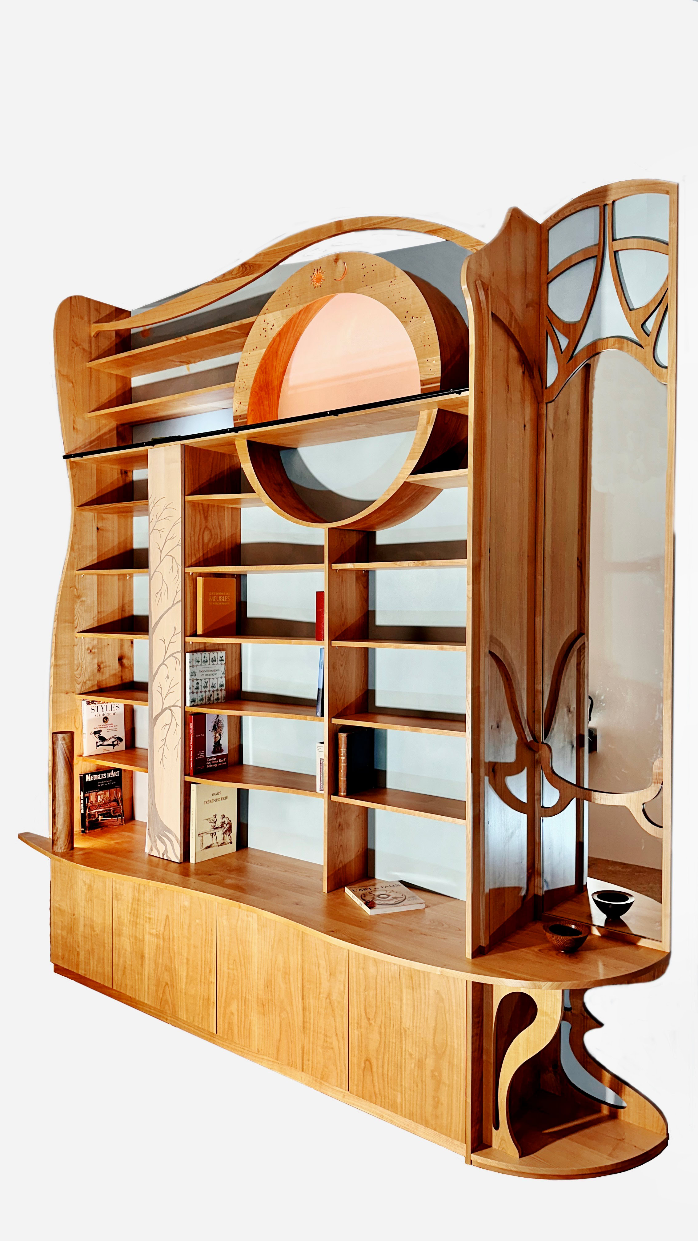 Bibliothèque en cerisier avec marqueterie, lumière LED, miroir.
