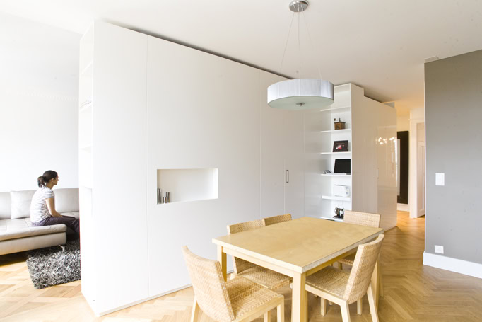 Meuble multimédia avec armoire bibliothèque laque blanche brillante et mat selon zone