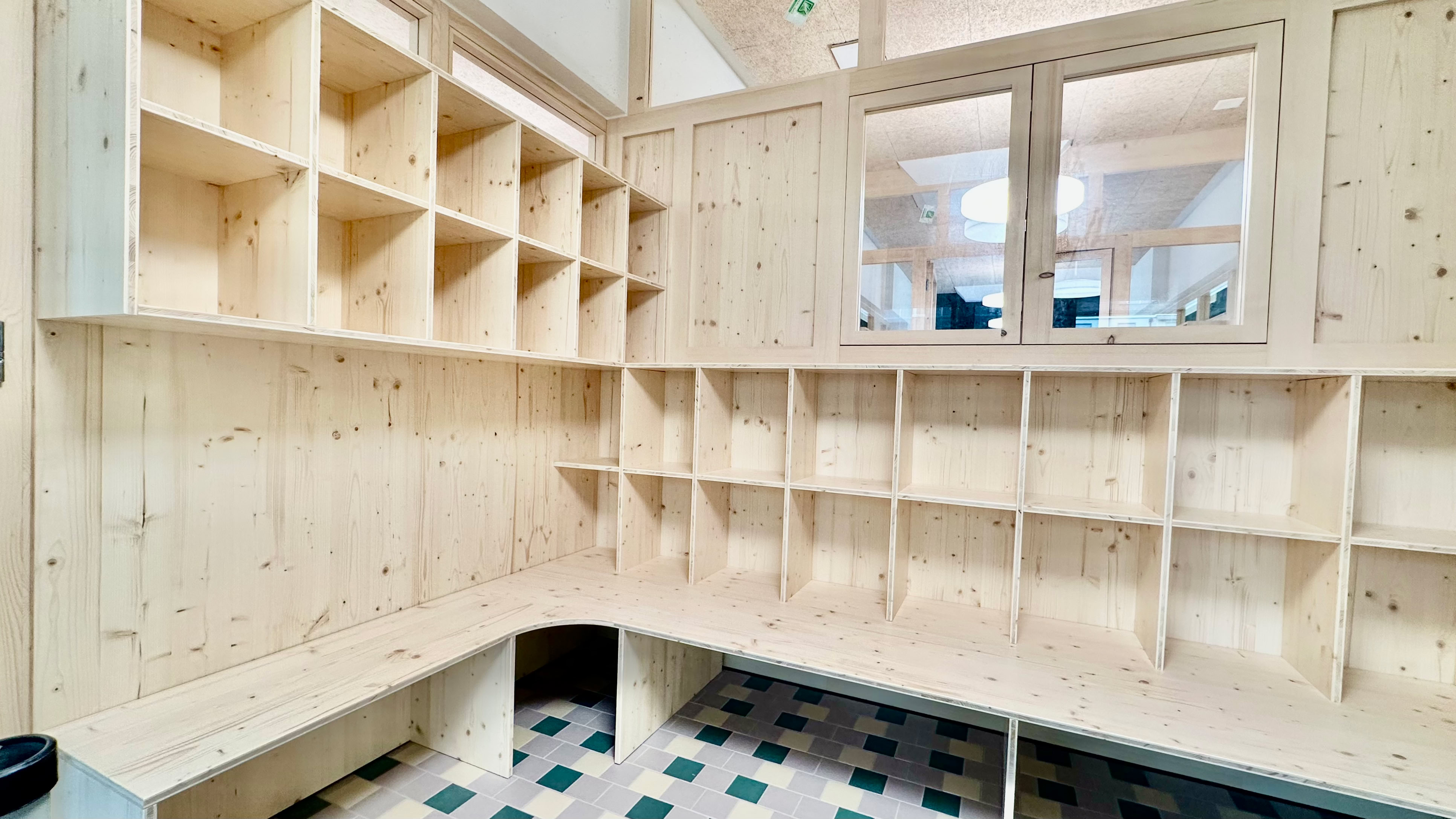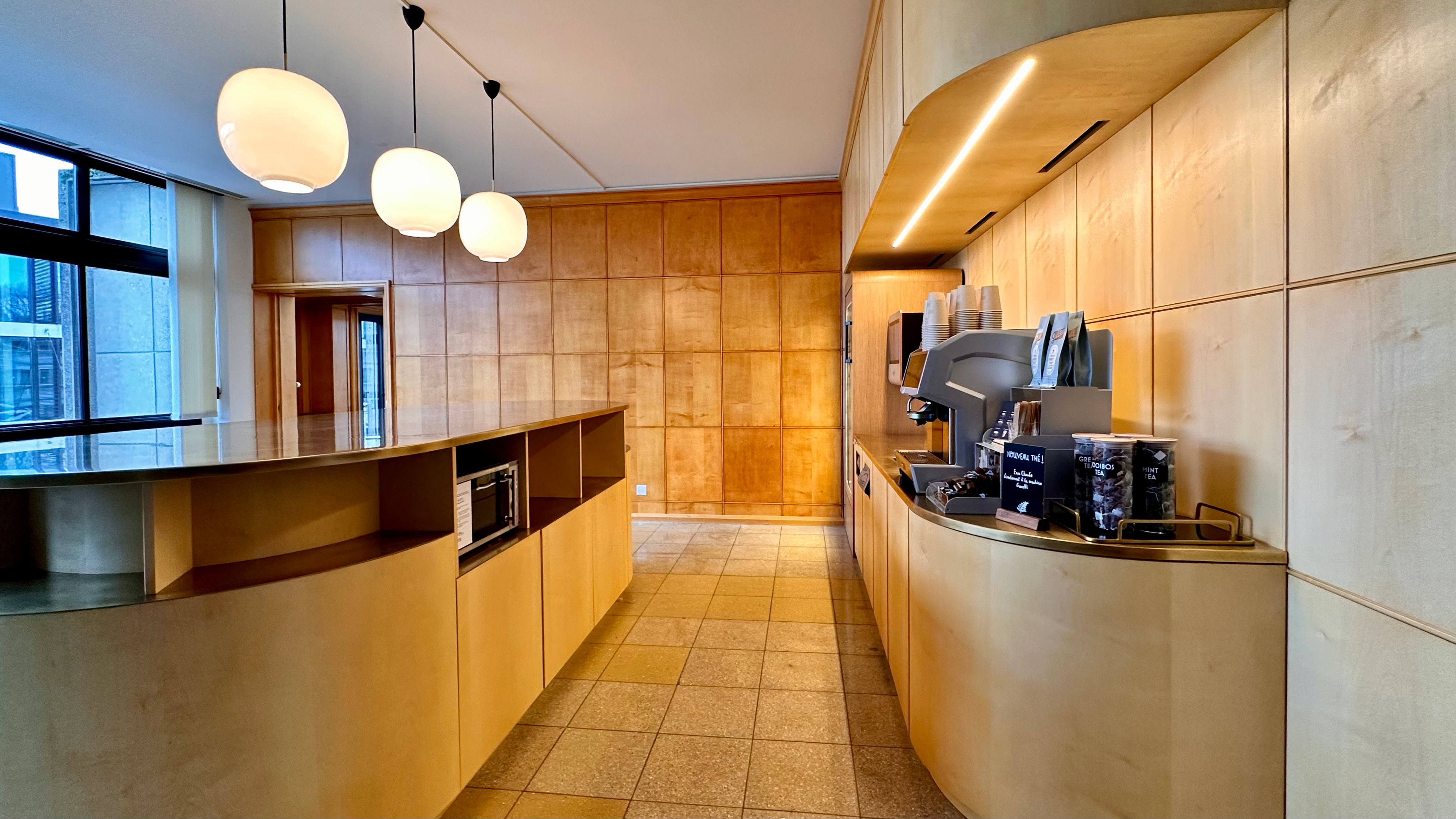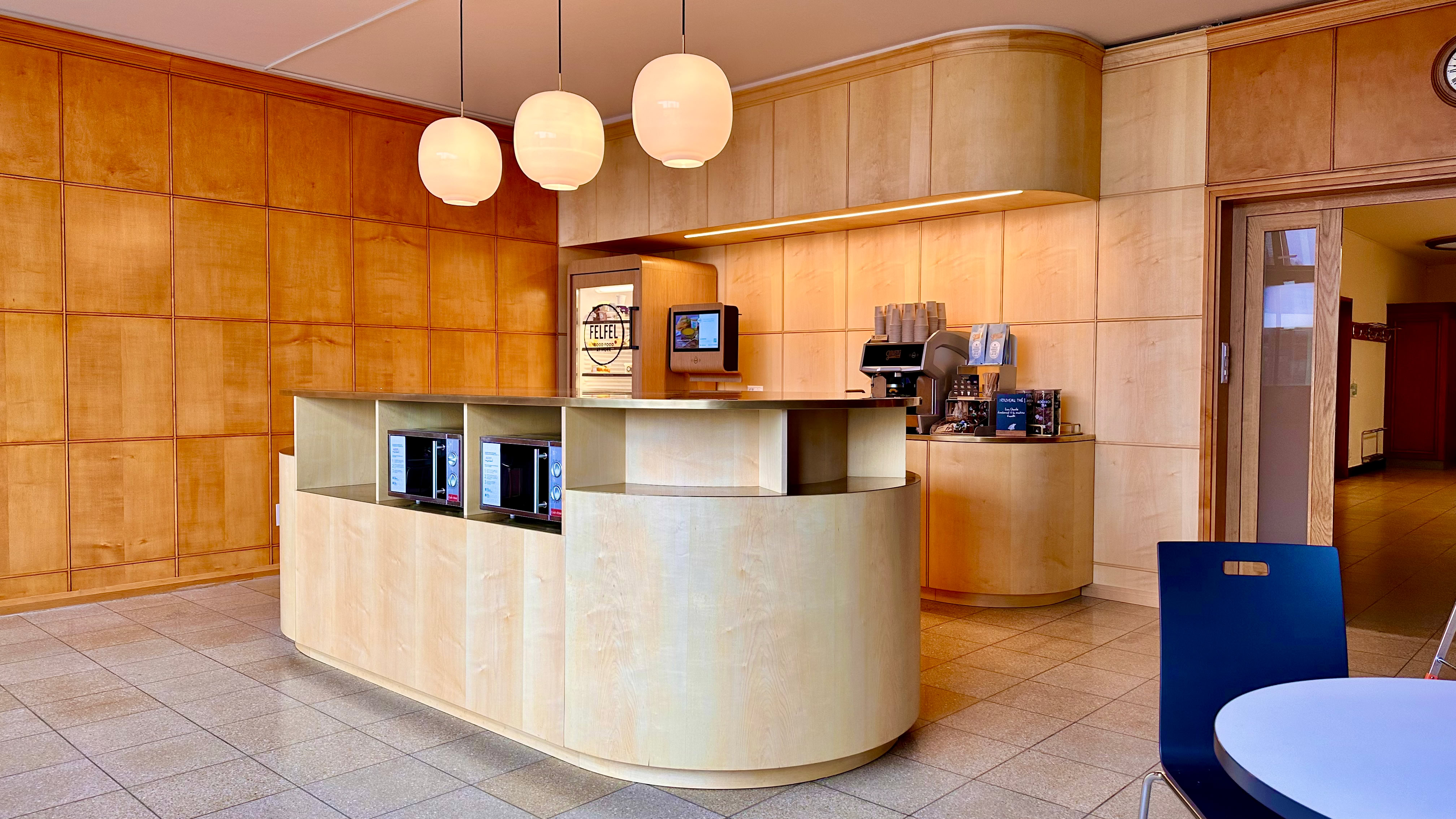 Réhabilitation du comptoir de la cafétéria de l'université de Fribourg selon des photos et plans d'époque.
